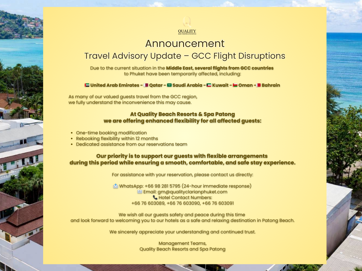 Quality Beach Resorts & Spa Patong was built with a very specific intention in mind: creating an environment for a relaxing and enjoyable stay. Our boutique beach resort is located near the famous Patong beach with luxurious swimming pools and golden traditional Thai design. With natural ingredients, we offer aromatic spas in Patong using our herbal massaging oils and also dining options for guests, including a Thai and Indian-themed all-day Restaurant, a Pool Bar, and James & Joyce – a lively Irish Pub.